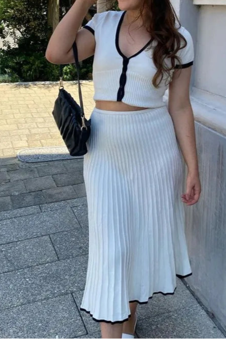 The LuxeRib™ Pleated Set combines chic sophistication with everyday wearability. Featuring a ribbed knit top with contrasting details and a flowing pleated midi skirt, this set offers the perfect balance between comfort and elegance.